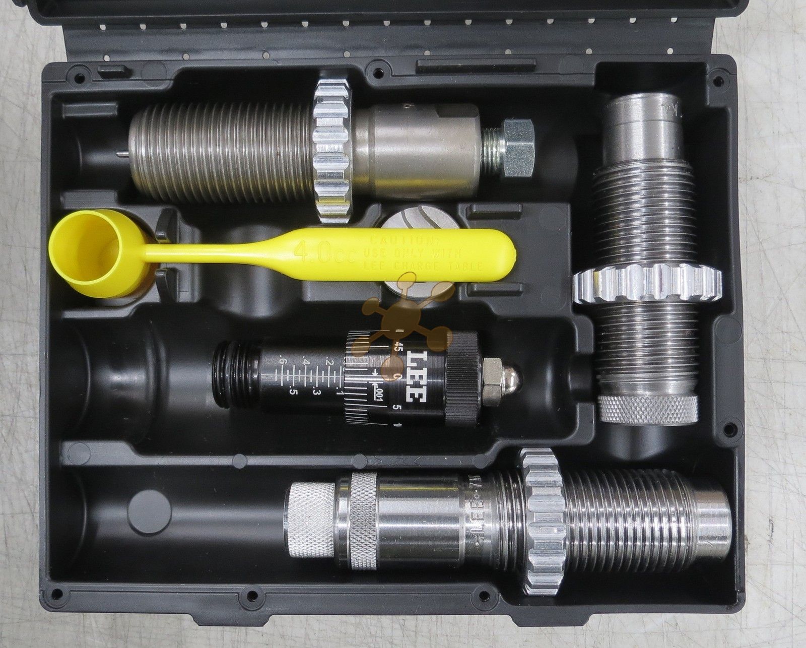 Sada matríc Lee Pacesetter Die Set. Obsahuje celoformátovaciu, usadzovaciu a krimpovaciu matricu, držiak nábojníc a naberačku na prach.